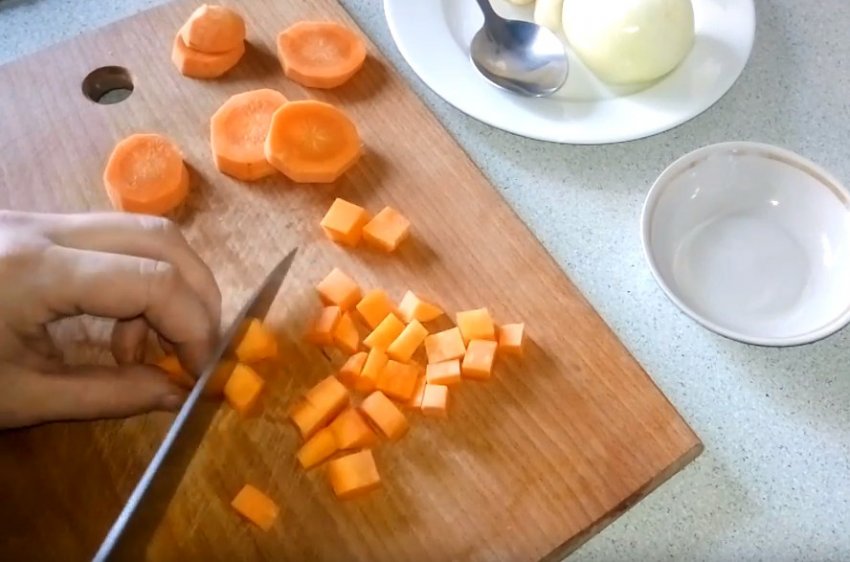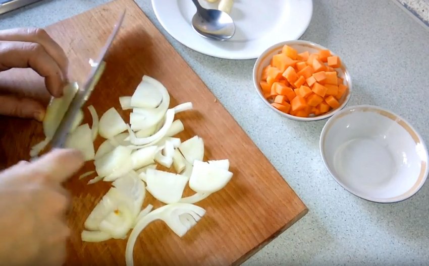 - Моркву нарізати круглими шматочками, перець - кубиками, томат - шматочками завтовшки близько 2 см (завдяки помідорам страва набуде гарного томатного кольору), броколі розділити на суцвіття.