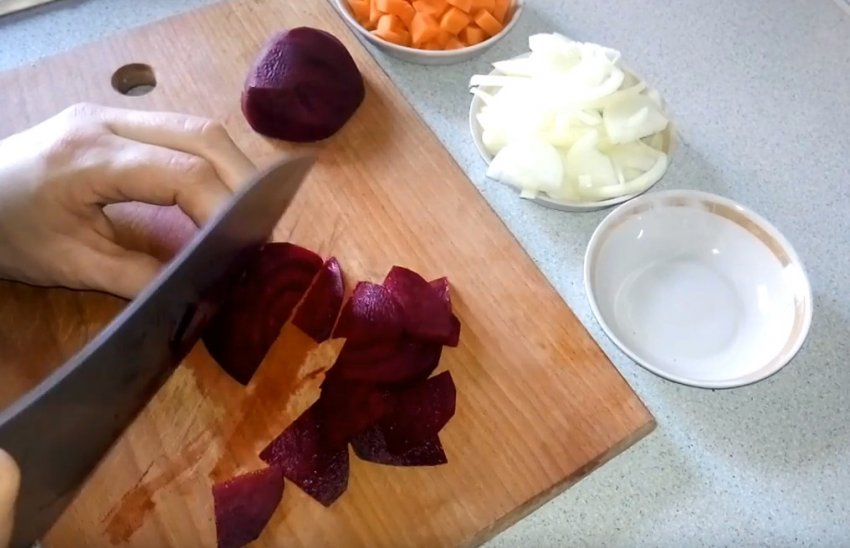 Буряк розрізати навпіл і нарізати тонкими пластинками.![]()
