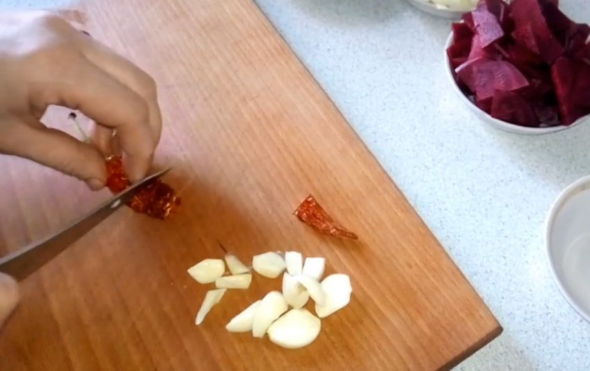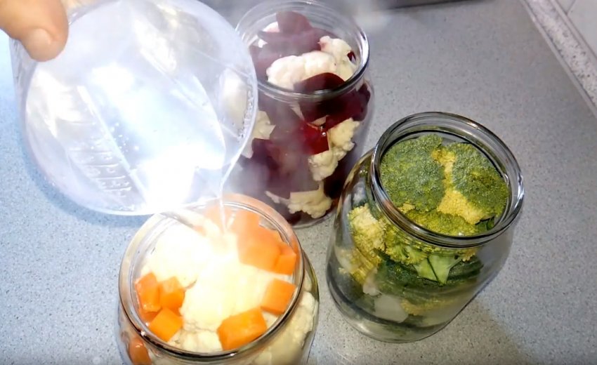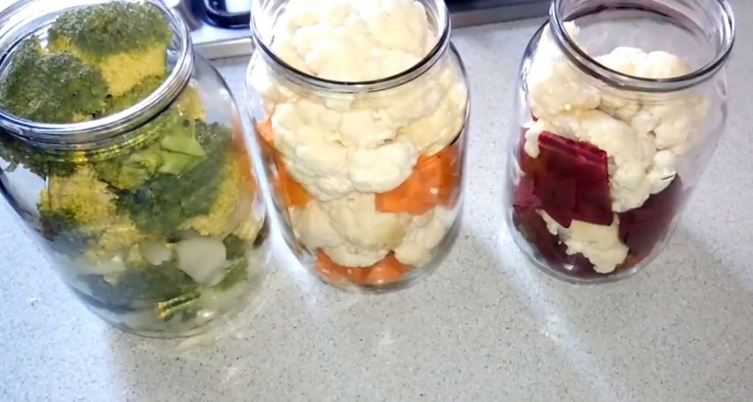 Взяти 3 банки об'ємом 1 л. Помістити в кожну з них часник, перець чилі, лавровий лист, гвоздику, запашний перець, моркву, цибулю, буряк. Можна зробити асорті з цвітної капусти та броколі.![]()