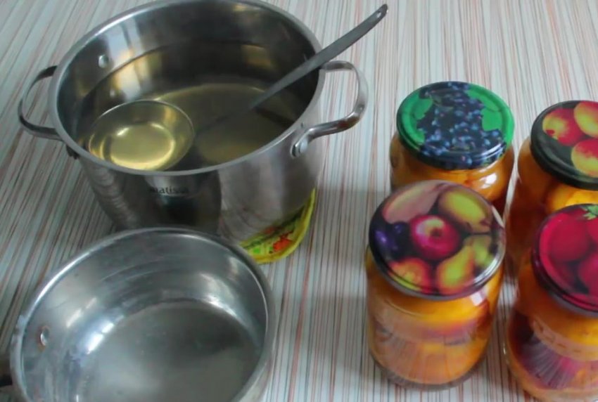 - Помістіть банку з компотом у каструлю так, щоб вода доходила до горлечка ємності.