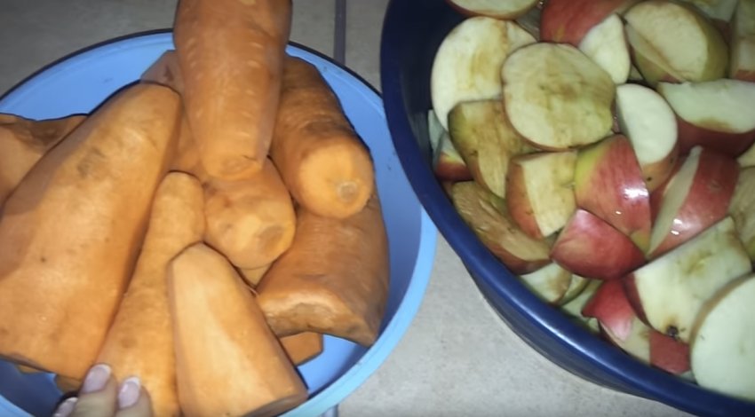 Яблука вимити, порізати четвертинками, видаляючи серцевину. Моркву вимити, очистити кожен овоч від шкірки.![]()