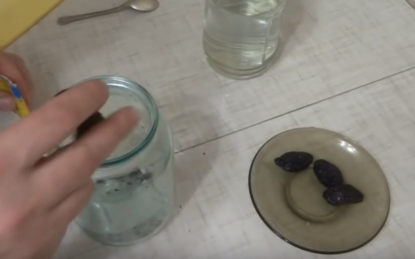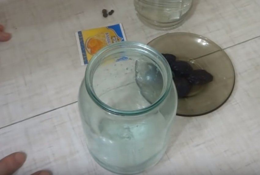 - На дно банки або пляшки помістити товчені спеції, чорнослив і ложку цукру.
