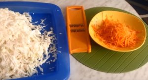 Капустяні листи нашаткувати, а морквину нарізати соломкою або потерти на крупній тертці.![]()