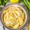 - Качани почистити, нашаткувати, змішати з сіллю і відставити на час, щоб пустили сік.