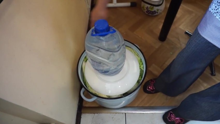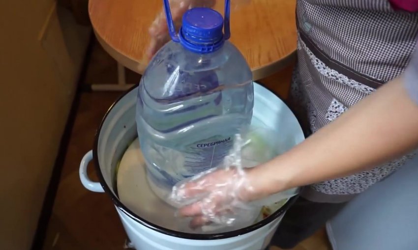 Потім зверху потрібно поставити гніт. Для цього поверх вмісту каструлі слід покласти перевернуту тарілку, на яку поставити п'ятилітрову пластикову пляшку з водою.![]()
