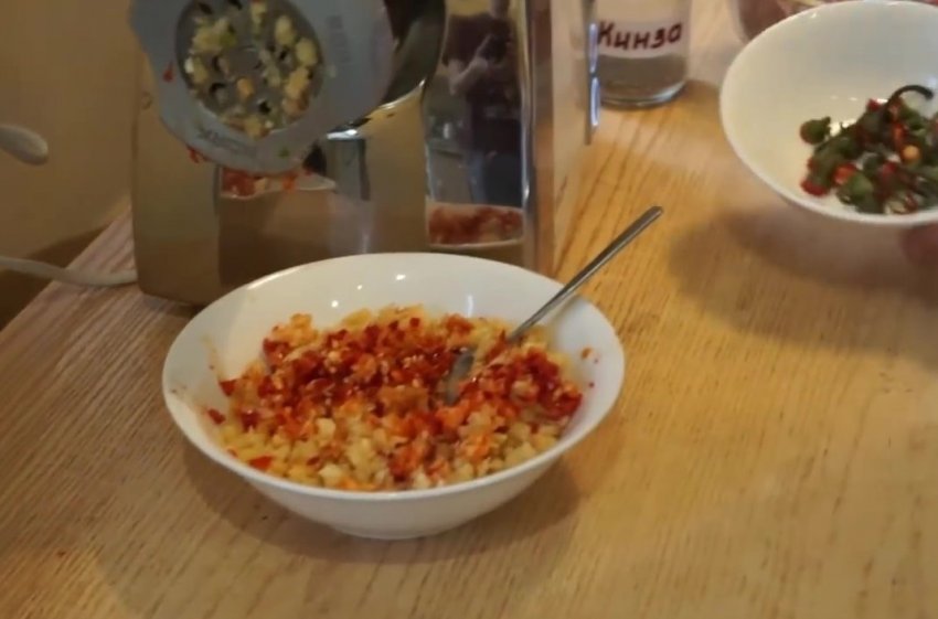 Гіркий перець, очищений часник перекручують на м'ясорубці. Можна скористатися блендером.![]()