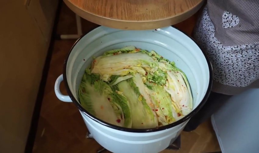 Каструлю залишити на добу в кімнатних умовах, щоб овочі пустили сік, а рідина затопила тарілку. Після закінчення зазначеного часу гніт знімають, а капусту дістають.![]()