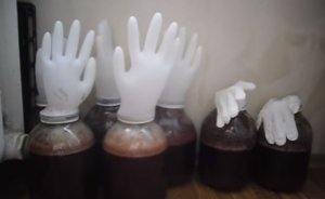 Далі суміш пропустіть через сито. Потім розлити по банках і надіти на горлечко гумову рукавичку (на кінці середнього пальця потрібно зробити дірку).![]()