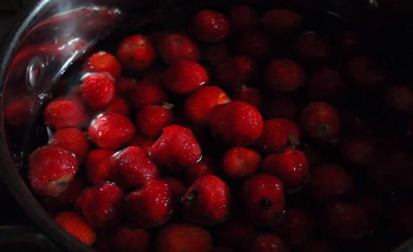 - За цей час виділиться сік і рідини стане більше. Полуничний сироп знову зливають у каструльку і закип'ячують вдруге.