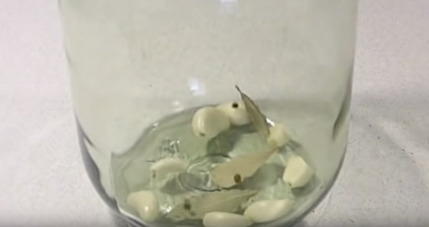 На дно ємності для маринування укласти прянощі з часником.![]()