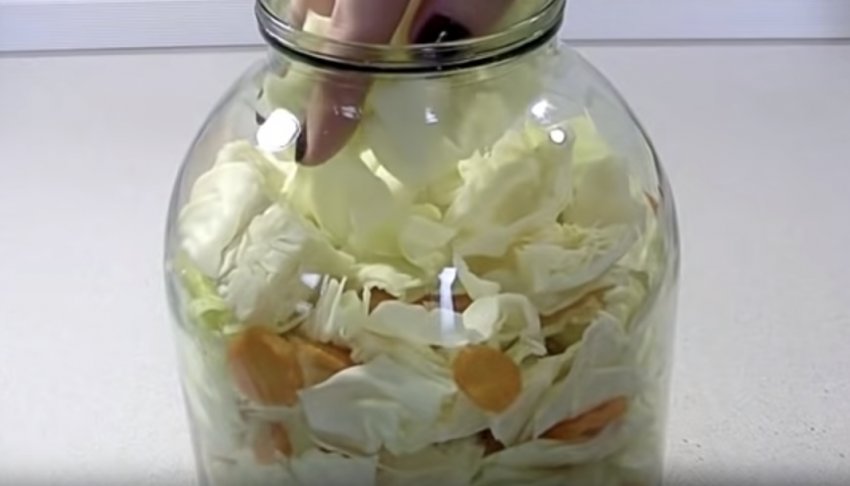 Нещільно скласти моркву з капустою, чергуючи їх пошарово.![]()