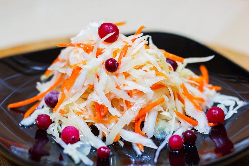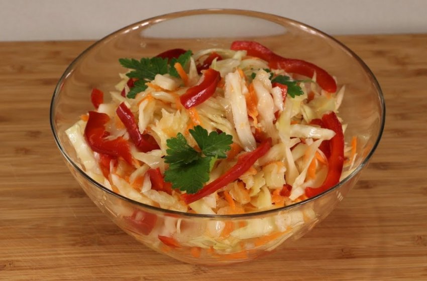 - Салат, що настоявся, перекласти в заздалегідь підготовлену ємність, накрити капроновою кришкою і перемістити в холодильник.