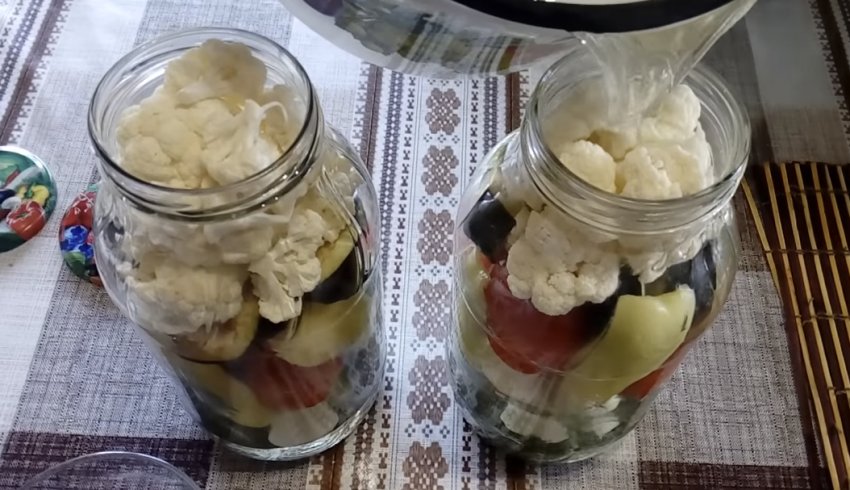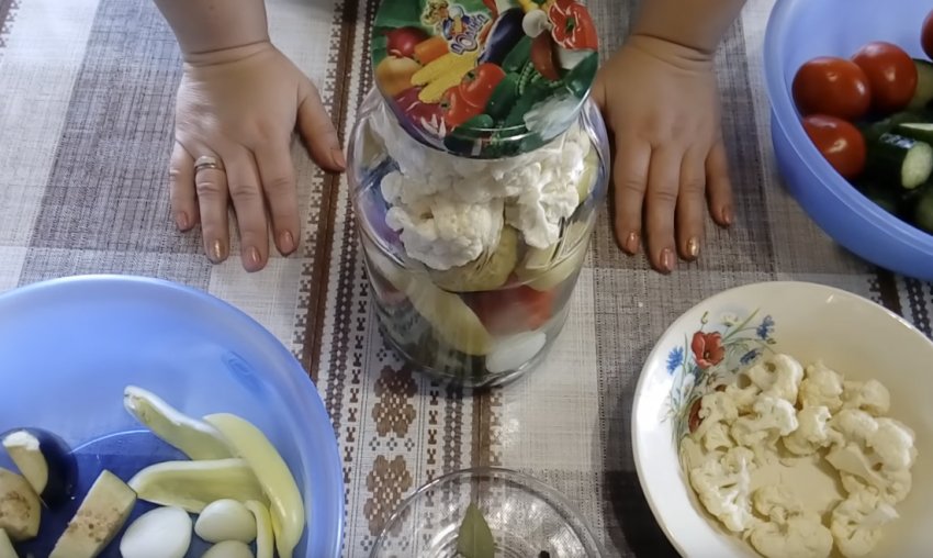 Поставити каструлю з водою на вогонь для приготування маринаду. На дно підготовленої банки укласти 1 лавровий лист і 2 часточки часнику. Потім додати огірки, цибулю, томати, перець, баклажани, цвітну капусту.![]()