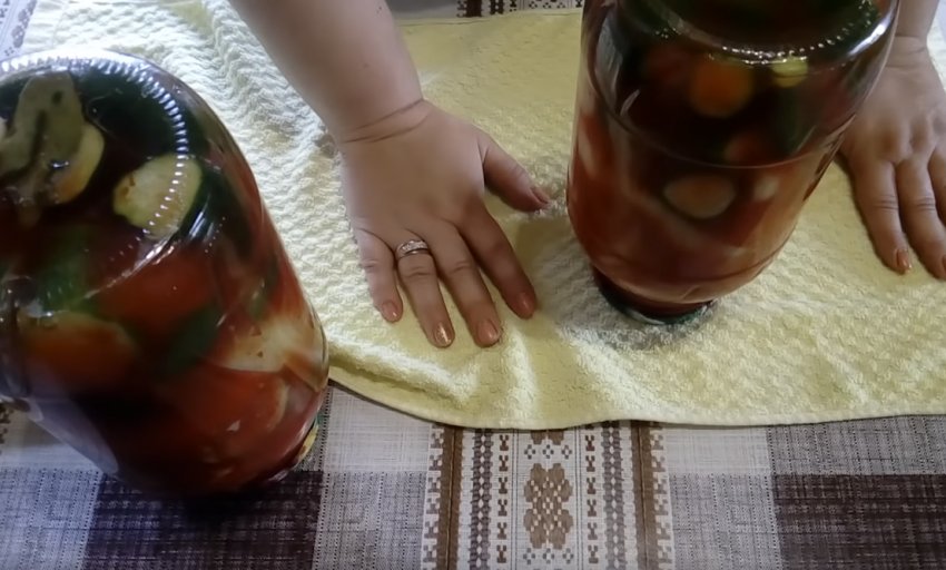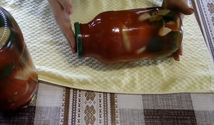 - Виймають продукцію і закочують кришками. Залишають на столі для повітряного охолодження, а потім прибирають на місце постійного зберігання.