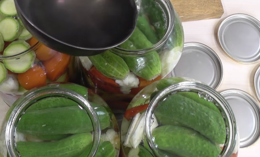 - Вимикають киплячий маринад, заливають ним підготовлену овочеву суміш.