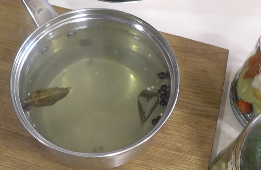 У каструлі готують маринад. Коли вода закипить, додають у неї перець горошком і лавровий лист, цукор, сіль. Через 5 хвилин кипіння додають оцет і знімають із вогню.![]()