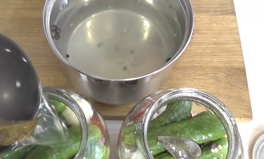 Заливку зливають у каструльку і додають до неї сіль, цукор, спеції, лавровий лист. Після того як суміш прокипить 5 хвилин, додають оцет.![]()
