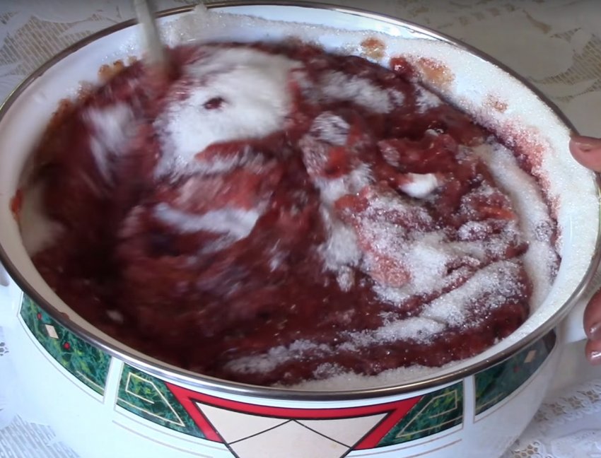 Підготовлену сливову м'якоть перекручують на м'ясорубці, засипають цукром і перемішують.![]()