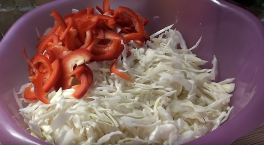 Нашаткувати капусту великими смужками приблизно 5-7 см завдовжки і 3 мм завширшки. Нарізати болгарський перець смужками довільної довжини.![]()