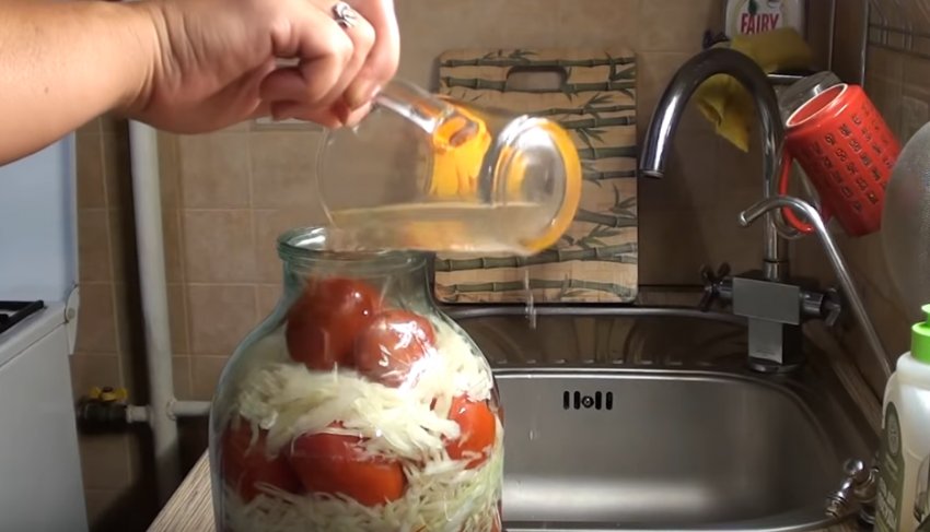 Далі викладати овочі шарами: капуста, перець, помідори до верху банки.![]()