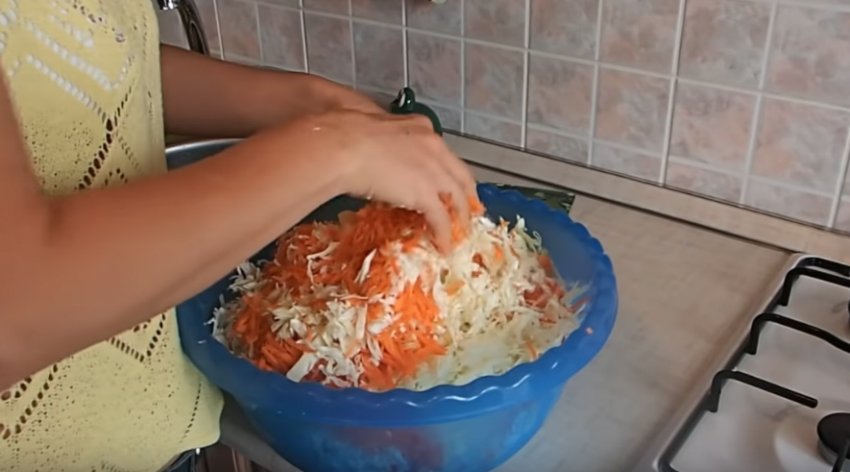 Натерти на крупній тертці моркву. Помістити овочі в об'ємний таз або іншу ємність, акуратно перемішати. Цей рецепт не вимагає виділення капустяного соку, тому м'яти овоч не потрібно.![]()
