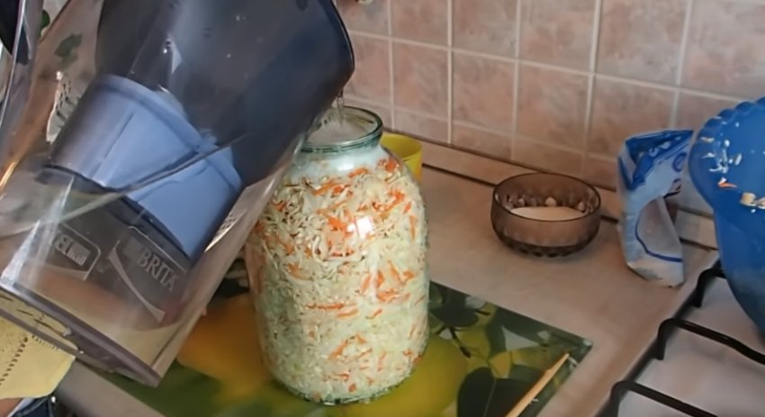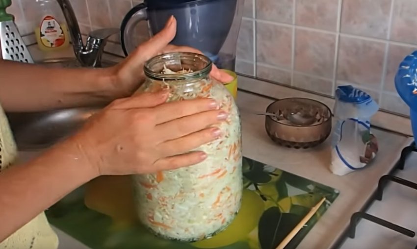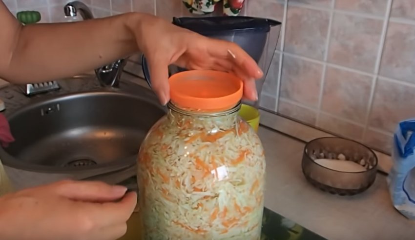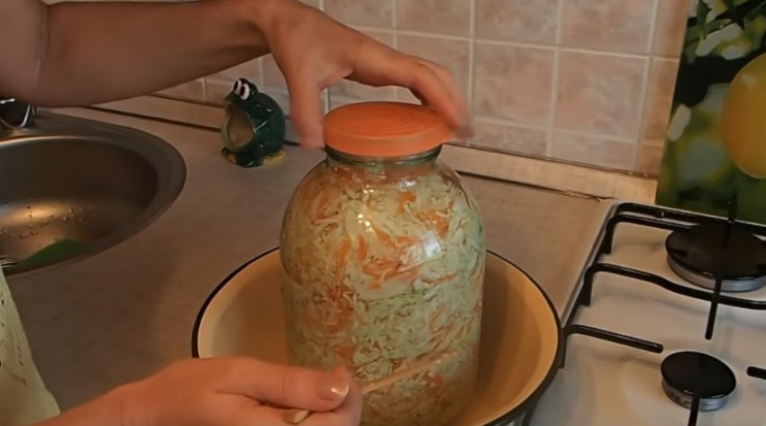 - Горлечко банки зручно прикрити кришкою, зворотним її боком, щільно закривати не можна. Можна прикрити чистою тканиною. Під час ферментації овоч почне виділяти сік, тому ємність краще поставити в таз або миску.