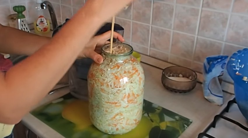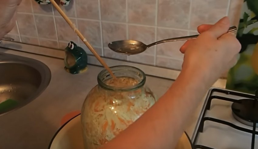 Щодня протягом 2-3 діб кілька разів на день (3-4 рази) потрібно проколювати шпажкою квашений продукт до дна, щоб з овоча виходили гази і гіркота. За потреби розсіл, що витік з миски, можна підливати назад у банку.![]()