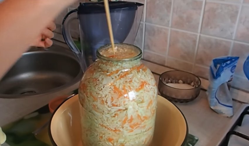 Дерев'яною довгою шпажкою слід кілька разів проткнути капусту донизу, щоб вода повністю покрила весь вміст. Якщо вода добре вбереться, то її слід ще додати, щоб до капусти не було доступу повітря.![]()