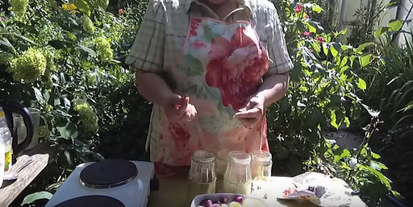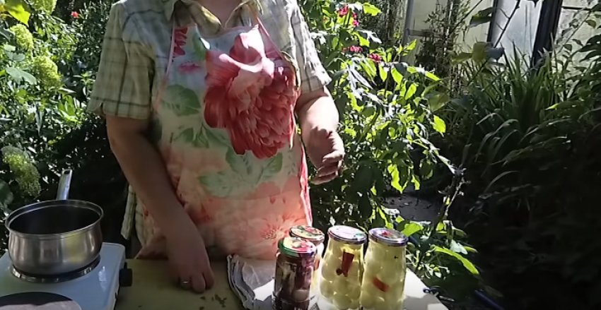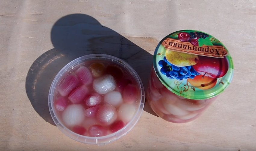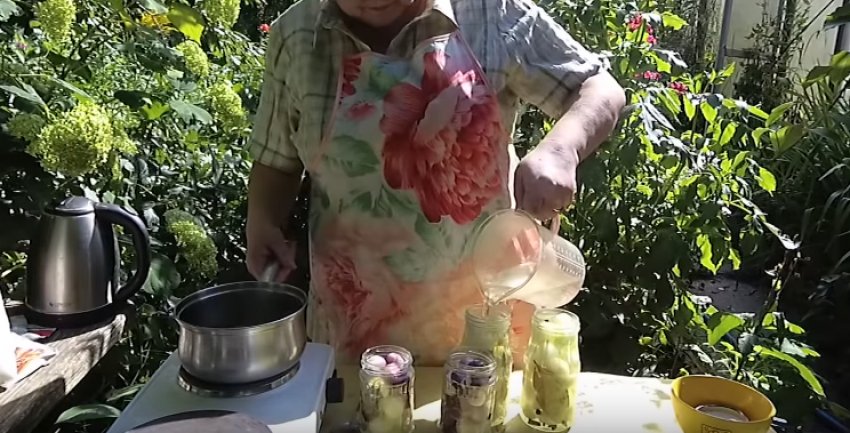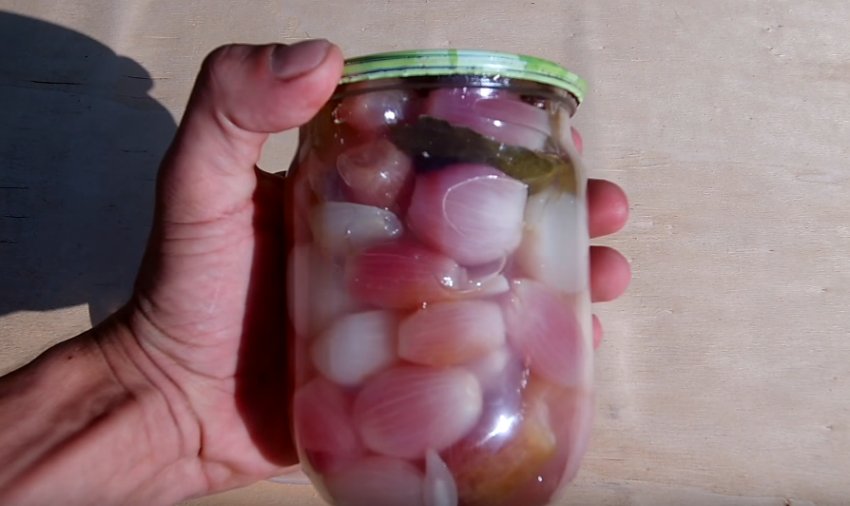 Зварену в розсолі цибулю засипають у банку й закупорюють за допомогою ключа для консервації. Якщо в банці виявляється текти, недолік усувають.![]()
