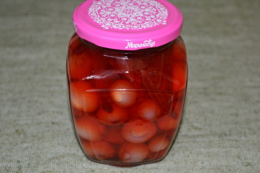 Мариновані цибулини закривають у маленькі ємності, об'ємом, що не перевищує 350-500 мл. Одночасно стерилізуються банки з кришками.![]()