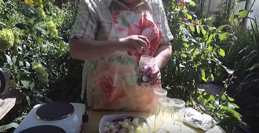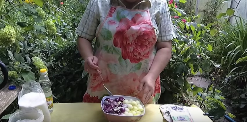 Дрібну цибулю сіянку очищають від шкірки і промивають у прохолодній воді. Цибулини висипають на друшляк і дають стекти волозі. Скляну банку (об'ємом 0,5 л) добре вимивають із милом, полощуть у чистій воді, після чого стерилізують на парі або прогрівають у мікрохвильовці 15 хв.![]()
