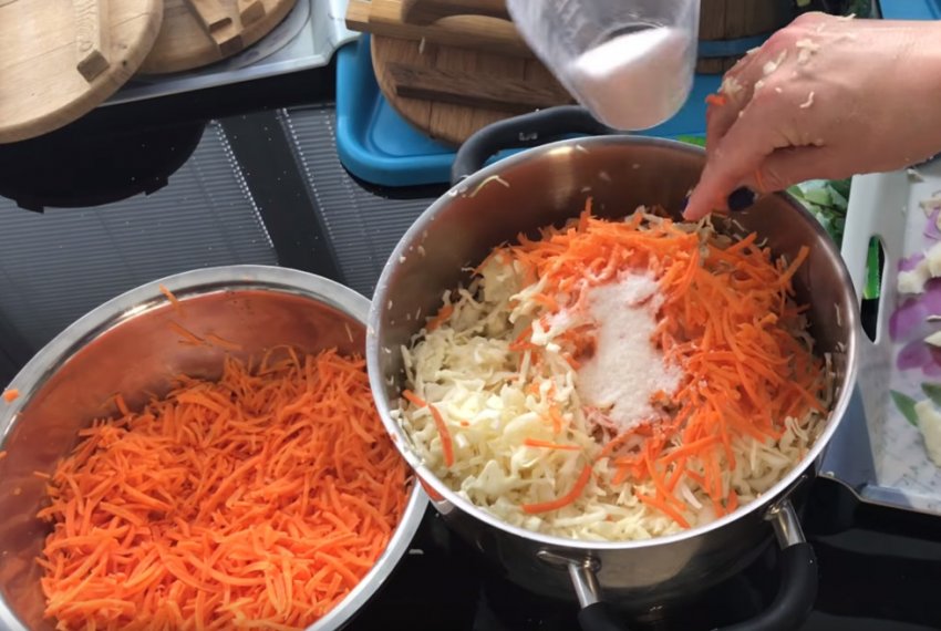 - Моркву натерти на крупній тертці, змішати з капустою.