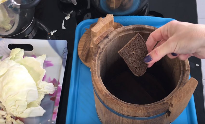 На дно дубової бочки покласти черствий шматок житнього хліба і цілі капустяні листки.![]()