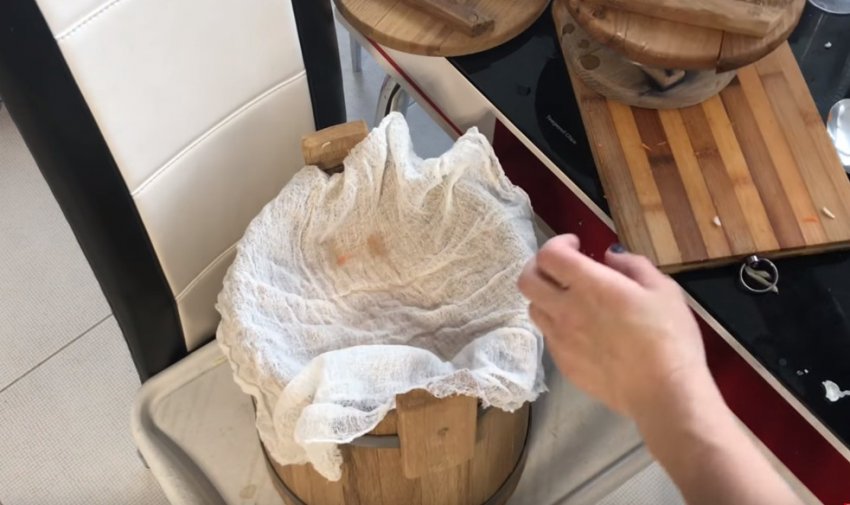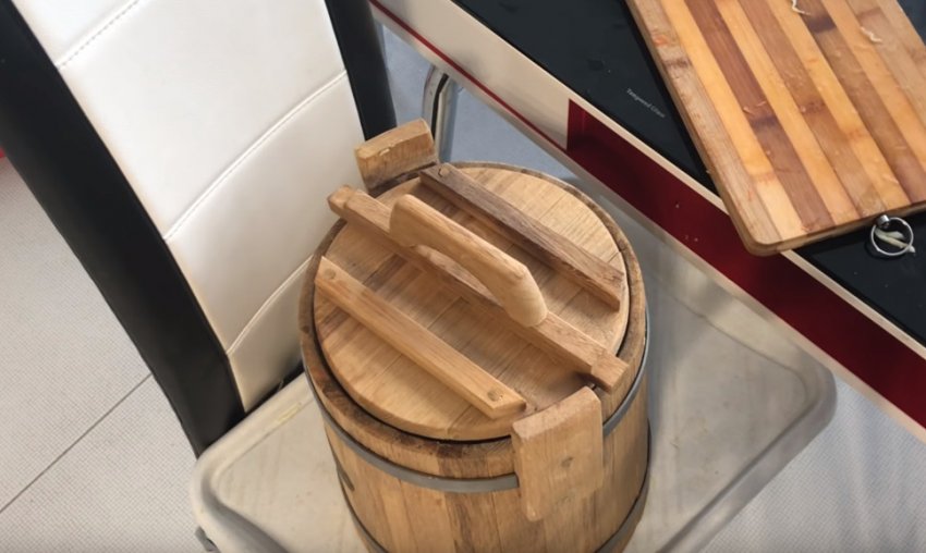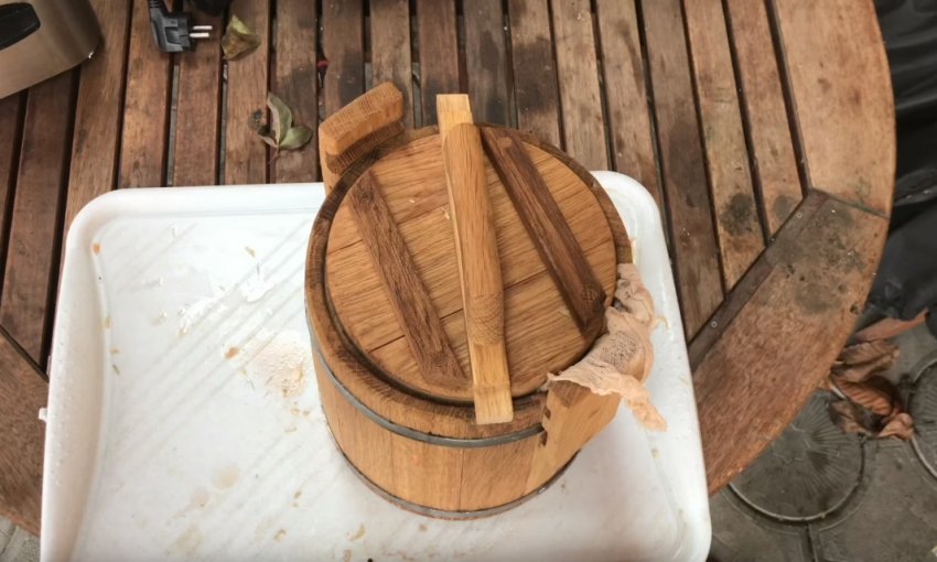 - Зверху поставити дерев'яну кришку і на неї гніт.