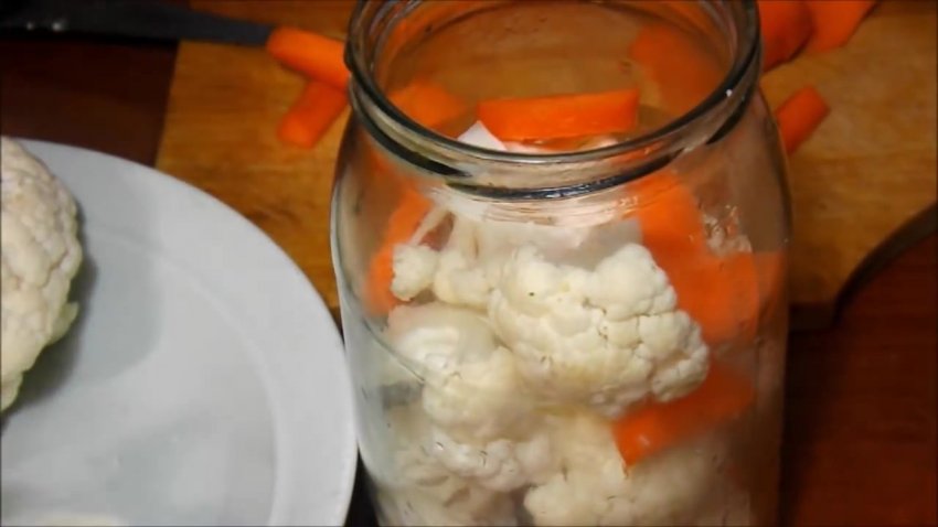 Банки та овочі вимийте, капусту розділіть на суцвіття, а морквину поріжте кільцями або кубиками.![]()