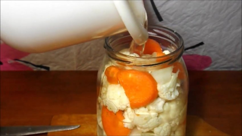 Наповніть банку овочами. На дно банки кладіть моркву, селеру, потім щільно - суцвіття (але не трамбуючи), а також моркву, що залишилася, і часник. Банка має бути наповнена не до країв, залиште місце, щоб розсіл повністю покрив овочі.![]()
