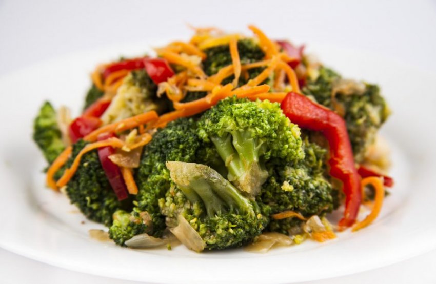 - У широку миску висипте відварену броколі, моркву, цибулю, болгарський перець, часник і все гарненько перемішайте.