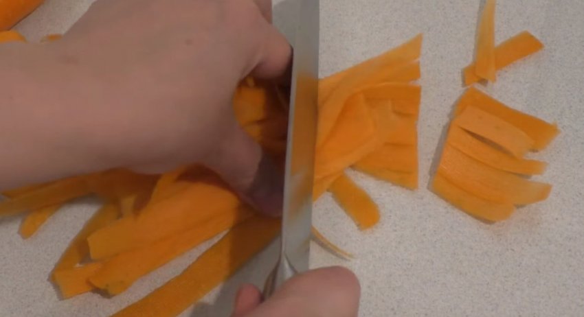 Моркву вимити, почистити й нарізати овочерізкою на тонкі пластинки на всю ширину (уздовж). Пластинки нарізати на шматочки довжиною близько 4 см.![]()