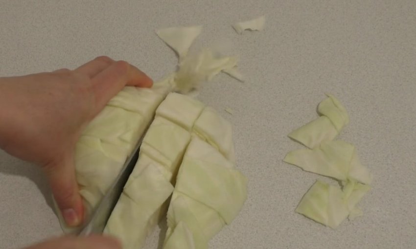 Розділити качан на 5 частин, качан видалити. Кожну частину розділити на смужки, а потім ще на квадрати. У підсумку мають вийти шматочки розміром 4×4 або 5×5 см.![]()