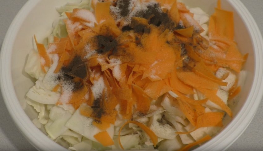 Скласти овочі в миску і засипати цукор, сіль і спеції.![]()