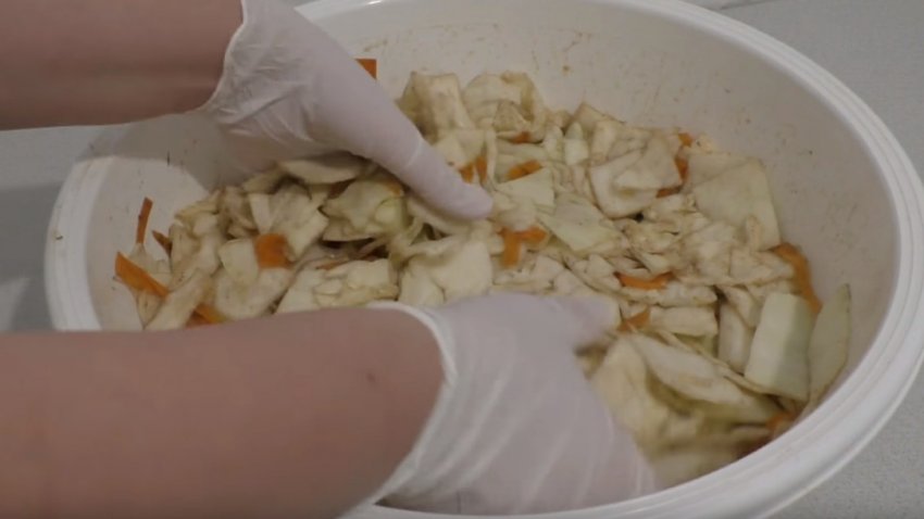 Сильно пом'яти овочі зі спеціями руками, поки не з'явиться рідина.![]()