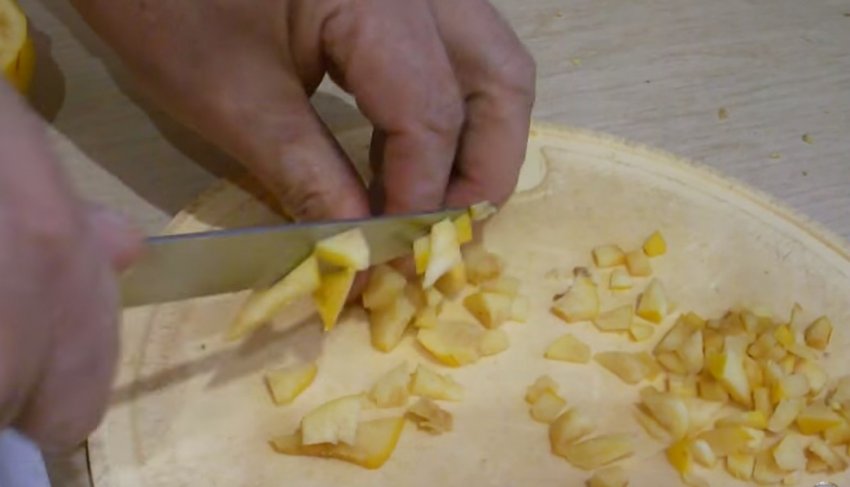 Айву ріжуть на кубики і разом з імбиром відправляють у ємність.![]()