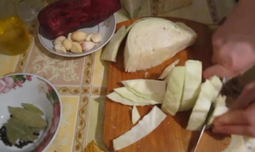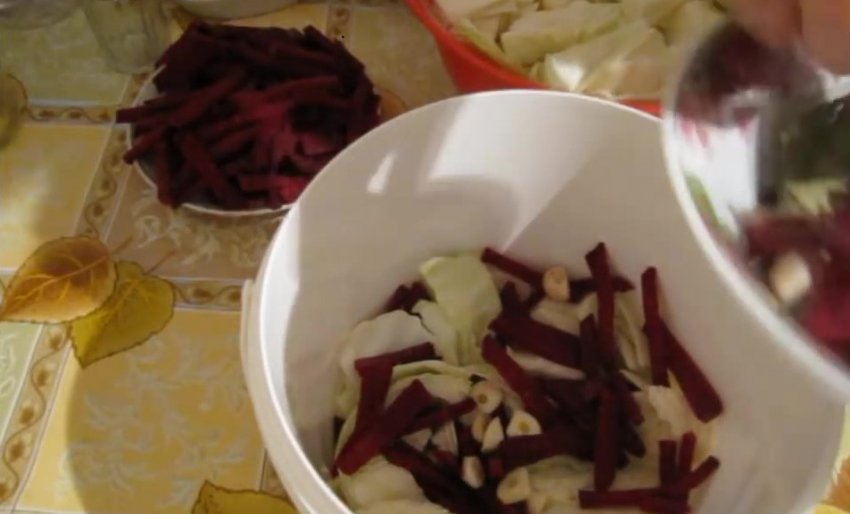 - Капустяний качан розрізають на 4-6 частин, після чого кожну частину овоча нарізають впоперек на 3-4 великі фрагменти. Капустяну нарізку, не руйнуючи кожен відрізок на пелюстки, укладають у ємність для засолювання в один шар, злегка присипають кільцями часнику і (трохи рідше) кільцями гострого перцю. Наступним роблять прошарок із листя селери, поверх якого укладають в один шар буряк. Далі повторюють усе укладання в перерахованій послідовності, починаючи з капустяного шару. Так роблять доти, доки вистачає підготовлених і нарізаних овочів. Овочі укладають щільно, не допускаючи виникнення пустот.