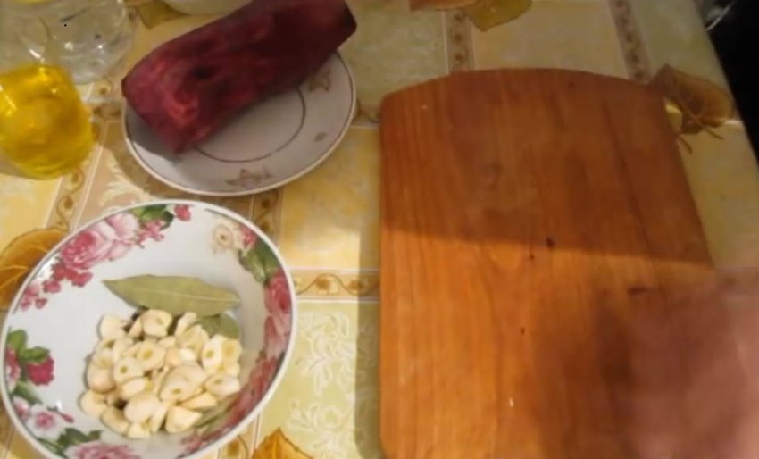 - Зубки часнику звільняють від шкірки і нарізають тонкими поперечними часточками. Часникову нарізку складають в окремий посуд і на деякий час відставляють убік.