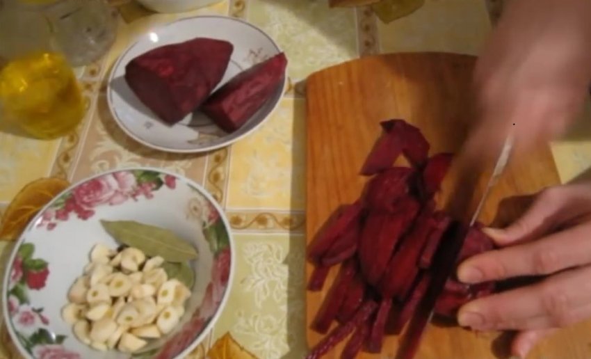 Сирий буряк нарізають на пласти товщиною до 0,5 мм, після чого кожну пластинку ще раз нарізають (впоперек) соломкою товщиною 0,5 мм. Це можна зробити швидко, якщо скласти стопкою всі нарізані овочеві кільця, і тільки потім робити поперечну нарізку соломкою. Бурякову заготовку висипаємо в окрему глибоку тарілку.![]()