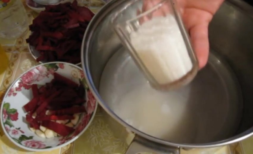 - Приготування заливки. У гарячій воді розчиняють склянку цукру, і тільки після цього додають інші інгредієнти (рослинну олію, сіль і оцет). Усі складові заливки змішують і доводять рідину до кипіння. Гарячу заливку акуратно виливають у банку поверх капустяної нарізки так, щоб окріп якомога менше торкався стінок горлечка банки - це допоможе уникнути появи тріщин на склі. Якщо маринаду буде трохи не вистачати для того, щоб повністю покрити овочі, не варто турбуватися, протягом години овочі виділять сік, який і покриє недолік заливки.