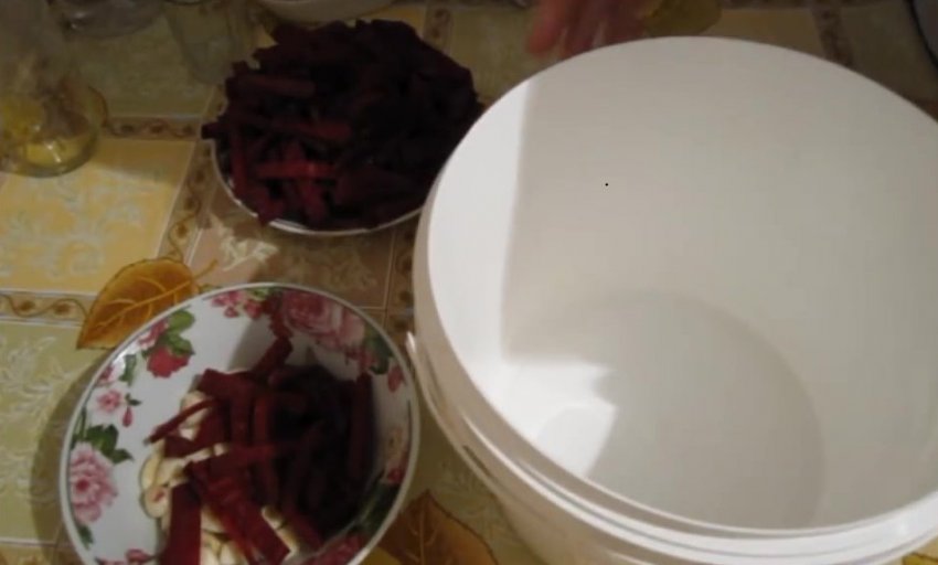 - Моркву, часник і буряк натирають на тертці для корейської моркви або ж подрібнюють за допомогою спеціальної насадки комбайном. Подрібнені овочі додають до капустяної нарізки і добре все перемішують. Під час перемішування бажано не надто м'яти овочі. Домігшись однорідності овочевої суміші, її засипають у чисту і суху ємність (емальовану каструлю або трилітрову банку). Укладаючи капусту, її утрамбовують якомога щільніше.