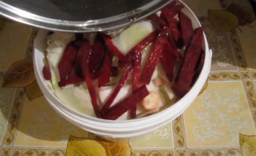 - Дно великої емальованої каструлі, об'ємом не менше ніж 10 л, вистилають вимитими і просушеними від крапель води, вишневими листками. На листя укладають великі шматки капусти, пересипаючи їх зубками часнику, брусками петрушки, селери і спеціями. Кожен капустяний шар відокремлюють один від одного щільно укладеними круглими скибочками буряка і моркви. Ємність заповнюють доти, доки не закінчаться овочі. Укладання роблять дуже щільно, за необхідності, додатково ущільнюючи овочі руками.