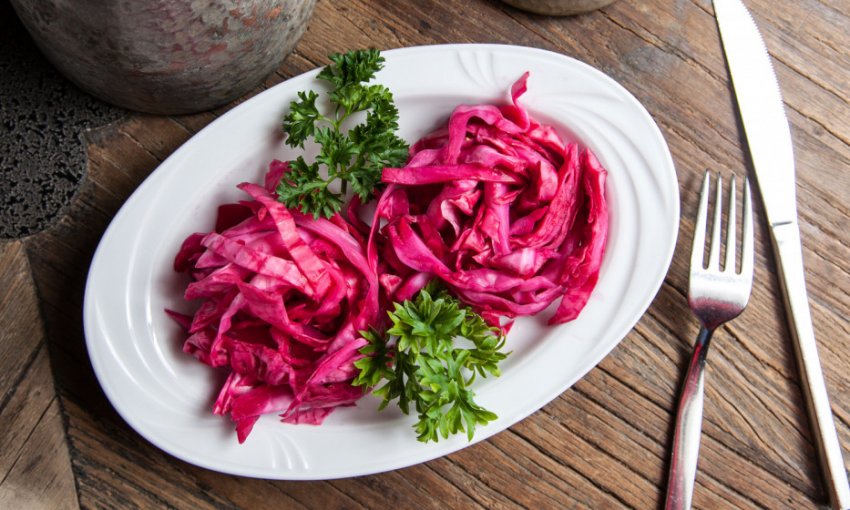 - На п'яту добу капуста по-грузинськи буде готова. Якщо ж господиня хоче, щоб готовність настала значно раніше, їй слід додати в заливку 30 мл 9% оцту - засолювання буде готове вже через два-три дні. У готової страви капустяна м'якоть буде соковитою і хрусткою, а бурякові кільця - м'якими.