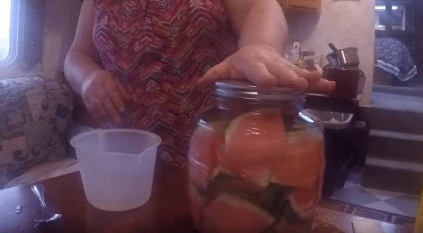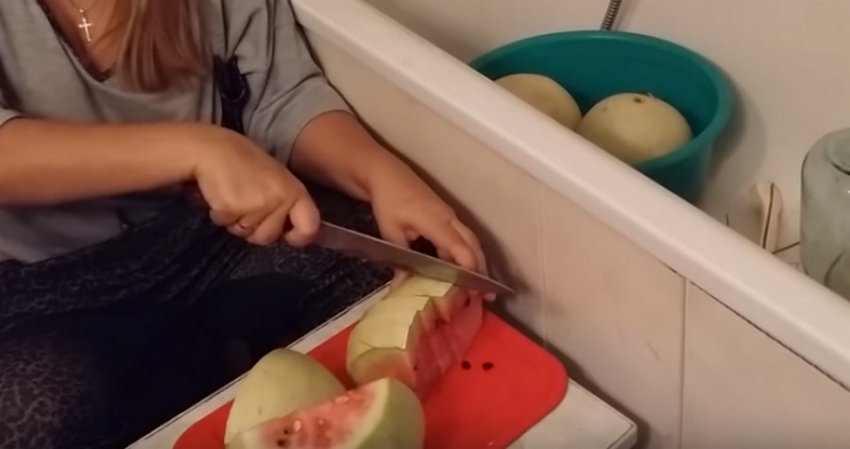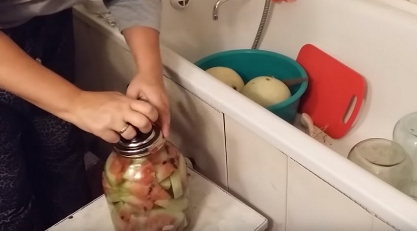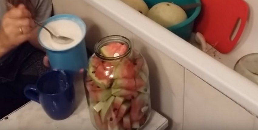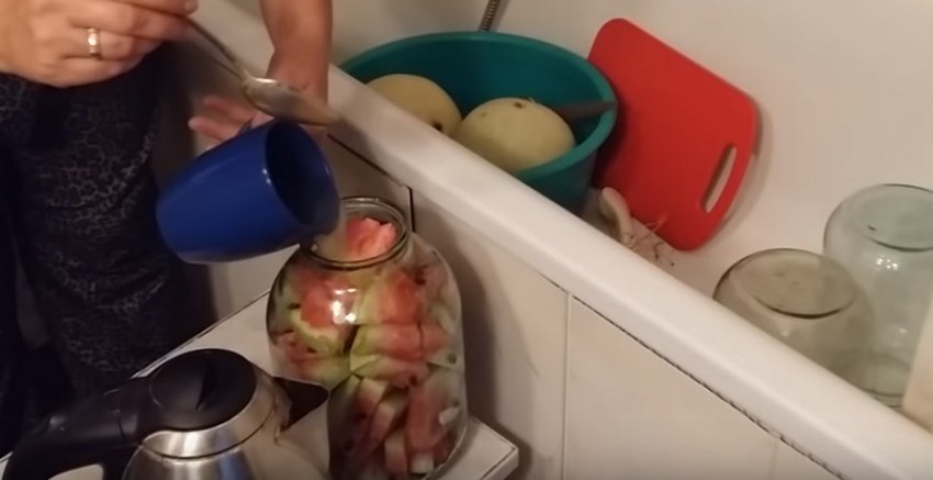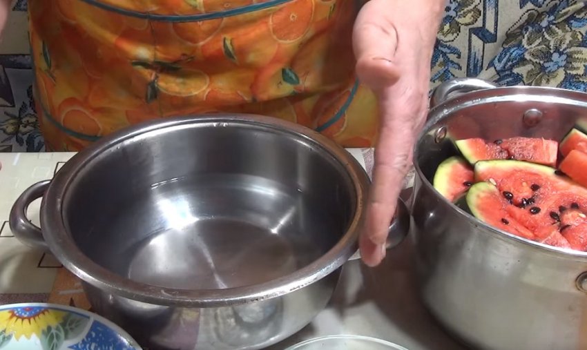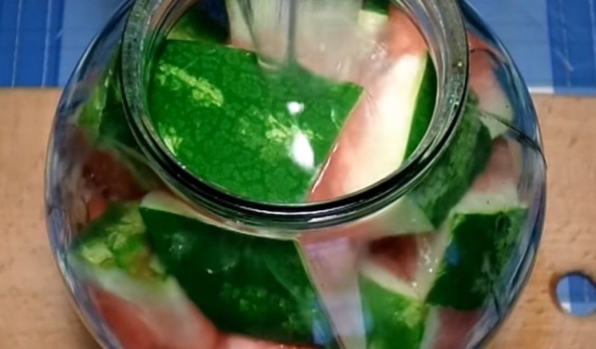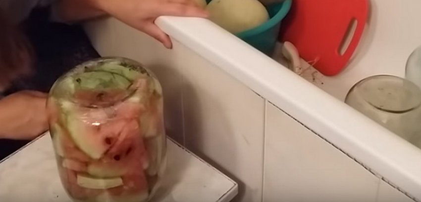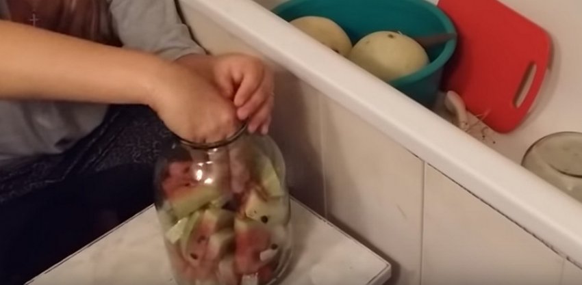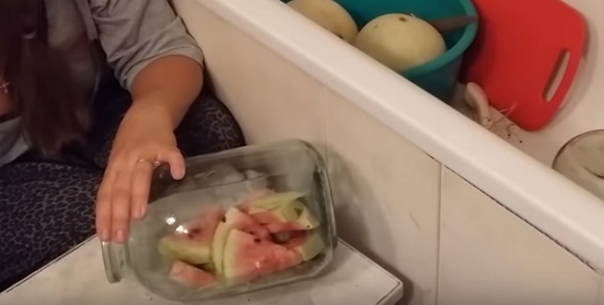 - Укласти цілі плоди у великі ємності, перешаровуючи кавуновою масою.